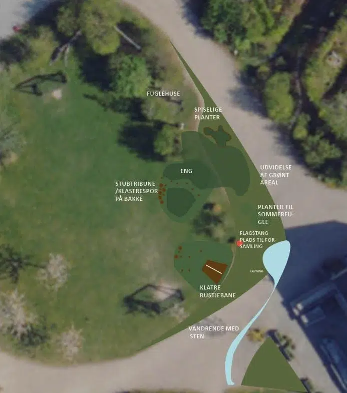 Bofællesskabet Landsbyen i Humlebæk har store græsarealer, og de ønsker at omdanne dele af græsarealerne til et: ”levende og lærerigt område for børn og voksne, hvor biodiversitet og grøn formidling går hånd i hånd med leg, fællesskab og oplevelser i naturen”. Beplantningen sker med hjemmehørende arter, og der bygges et samlingssted af genbrugsmaterialer.